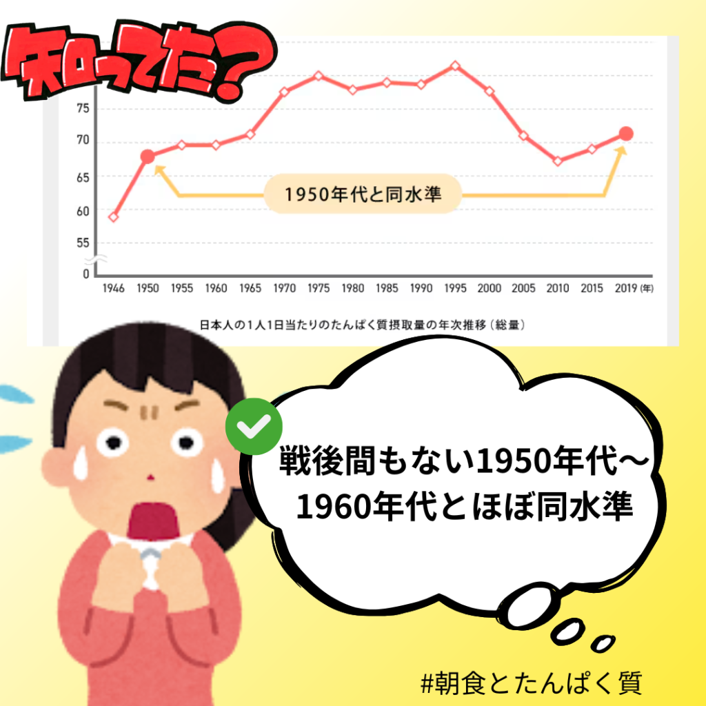 近年になって過度のダイエットや偏食傾向の影響で、たんぱく質の摂取量は激減!今や1950年代と同じくらいまで落ち込み